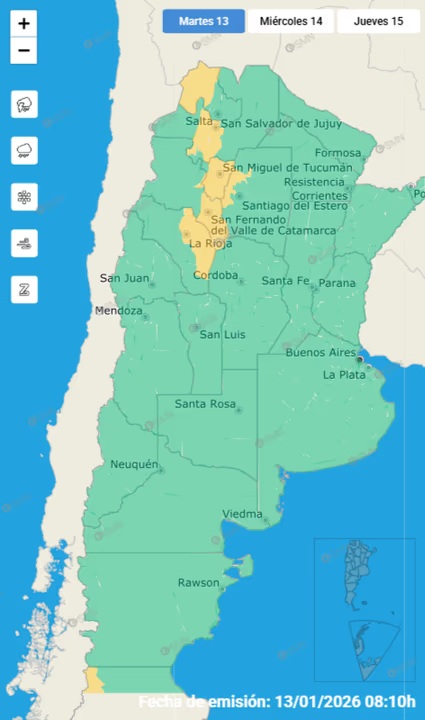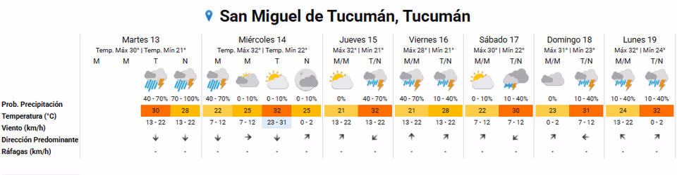 - Esta noche (martes 13): las condiciones desmejorarán notablemente. Se esperan tormentas fuertes con una probabilidad de precipitación de entre el 70% y el 100%. La temperatura se mantendrá elevada, rondando los 28 °C, con vientos del sector norte de entre 13 y 22 km/h.
