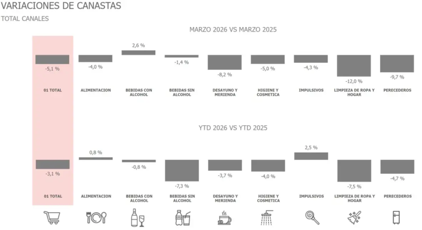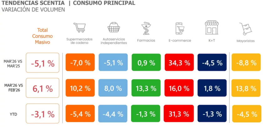 La baja fue generalizada en todo el país y alcanzó tanto a supermercados como a autoservicios y kioscos. Frente a marzo de 2025, el desplome fue especialmente marcado en las grandes cadenas, donde las ventas se redujeron un 7%. En el primer trimestre, la disminución es del 5,4%.